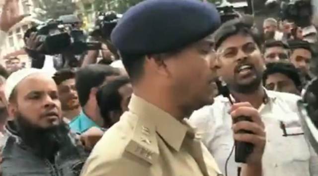 DCP of Bengaluru (Central) Chetan Singh Rathore sang the national anthem with the protesters. (Source: Videograb)