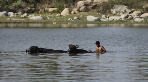 A man takes his buffaloes for a bath to provide relief from the heat at a pond in Hyderabad. (Source: PTI)