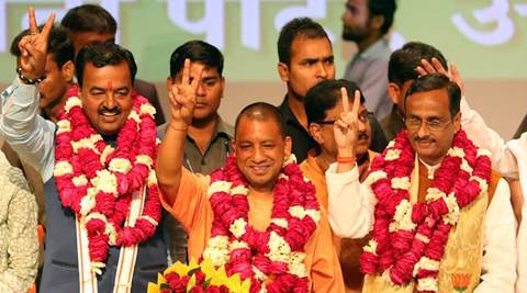 Yogi Adityanath wiht his deputies Keshav Maurya and Dinesh Sharma in Lucknow on Saturday. (Express photo by Vishal Srivastav)