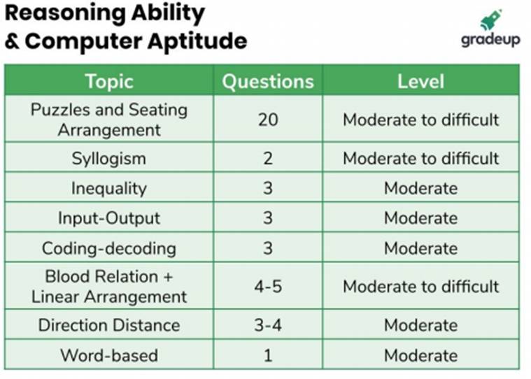 The overall difficulty level of the exam was difficult. Data Interpretation & Analysis section was the hardest, while Reasoning Ability and Computer Aptitude was moderate to difficult. English Language section was moderate to difficult whereas General/ Economy/ Banking Awareness section was moderate.