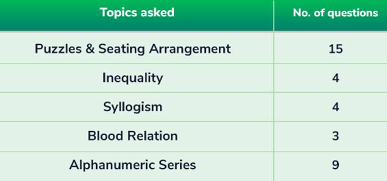 Reasoning Ability: Students had to attempt 35 questions in 20 minutes. The difficulty level was easy-moderate. One major surprise was that there were 9 questions asked from Alphanumeric series. Questions based on inequality were easy and time-saving. There were no questions asked from input-output topic. Below is the sectional breakdown: