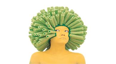 Ideas of sustainability and reuse fill her canvas, where Lalet uses everything from vegetables and fruit scrapes to empty egg shells and pompoms. Turning vegan has been part of the process. “Eating fish and meat does not make sense while the world is in a crisis,” says Lalet, who has also stopped buying new things unnecessarily. “Art is finally about making people smile and pushing people to question themselves,” she says.