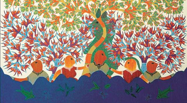 Urveti recalls how when he first painted on canvas, on Jangarh Singh Shyam’s impetus in the early ’90s, the colours spread in all directions as the artist had no previous experience in the medium. To calm him, Shyam’s mother said, “The way the colours have spread over this canvas, your work will also spread all over the world.” Years later, his works have travelled across the world, from Japan to France, Russia to Brazil. “Orally passed on from one generation to another, our folktales are not written anywhere and by painting them we want to share them with the world,” says Urveti, 49. Best known for his amoebic forms and the small arrow heads that fill his figures at this exhibition, he has, among others, the acrylic titled Bada Dev, with the main deity of the Pradhan Gond community invoked by the Saja tree that surrounds it in a circular maze. In Dudh, Dahi aur Mahi ka Ped (pictured), he tells the story of a king who planted three trees of the same name and resolved that only someone who could identify them can marry his daughter.