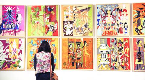 And what a writer he had become! Among his many seminal discourses on art, the first volume Moving Focus became a landmark. He continued to write, even bringing out a series of books for children, but he pursued painting alongside. At the Weavers Service Centre that he joined in 1961, his improvisatory instincts opened a new chapter in the textile history of India. At the New York World Fair in 1965 he had made a massive textile relief hanging by using hemp fibres twined with left over pieces of cloth, literally rags, that many remember as an extraordinary work. When the Black Partridge Art Gallery in Delhi invited him for a group show during the Emergency, he sent a hand crafted hemp peacock, a limp national bird. During these “textile” years, it can be assumed that his active engagement in the craft practices deepened his conviction in the fundamental interrelationship between art and craft. The opportunity for a larger mural project arrived in 1963 when he made a terracotta mural for the Rabindralaya in Lucknow, based on characters from Rabindranath Tagore’s The King of the Dark Chamber’ or Arup Ratan . In 1969, when architect Charles Correa invited him for the Gandhi Darshan project in Delhi, he drew upon Gandhian ideas to design a series of reliefs and free standing structures in cast cement and ceramic. It prepared him for another major endeavour — a unique ensemble of terracotta reliefs, followed by massive reliefs in cast cement, where he used the motif of a seed for the facade of the research and development wing of Jyoti Limited in 1974. The interplay of square grid in varied formations continued to recur in the subsequent series of paintings. Cutting across boundaries, the animated images slipped, jumped or flew from square to square, up and down, playing hide and seek. Gradually reverse glass paintings were replaced by acrylic sheets.