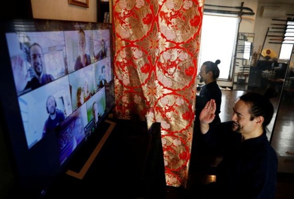 Holding a samurai sword “katana” in his right hand and an iPad in the left, Minamoto is now showing students the arts of the samurai on Zoom calls.
