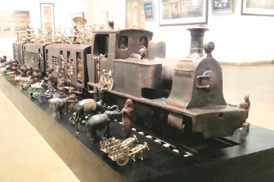 The artist is also exhibiting an 18-ft train installation — with the roof and compartments, platform and human figures moulded from fibre and metal — to bring alive the rail experience for viewers. The roof is loaded with utensils, cycles, lanterns and gramophones that travellers usually carried with them.