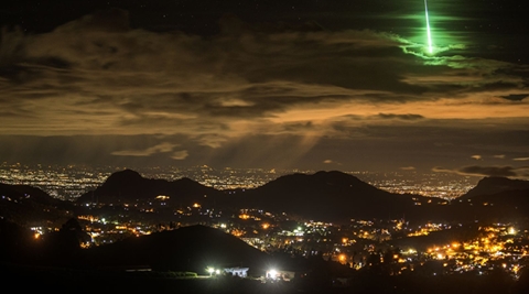 Prasenjeet Yadav shot a rather rare photograph with a green meteor up in the sky and the twinkling lights of the town below.