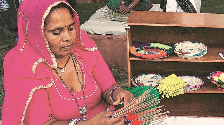 Among the pankhas — made of jhaadu sticks, khajur leaves, bamboo, wool, colourful cloth patchwork with beads, mirror, silk, satin and lace — is one semicircle red-green-painted dry grass one, resembling the headgear of a chhau dancer and is used for Barsha Ritu and Chhath Puja, a fan-maker tells us.