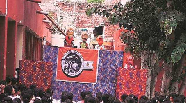 All the way from Hisar in Haryana, Nisha came by bike to tell Delhi her story. The Capital’s cultural district, Mandi House, was in the middle of evening rush hour when she made an appearance outside the Shri Ram Centre auditorium. A group of artists sitting around a tree, doing life sketches, were the first to stop and stare at her. The crowd from a chai shop were next to gather around. Passersby halted in their tracks. Nisha told them that her name means darkness. “But my ambition is as bright as sunlight,” she said clearly over microphones. Nisha is a muppet with a pink face and red hair and lives with a theatre group in Hisar, called Abhinay Rangmanch. A group of four has brought the muppets, props, sets and music systems on Royal Enfilelds which are parked near the performance space and bear the sign “Theatre on Bikes”. Over the next six months, members of the group will travel 6,500 km, in phases, covering cities and small villages in Haryana, Punjab, Himachal Pradesh and Madhya Pradesh, to perform before audiences who do not go to halls. The performers ride in on bikes, put up screens for the shows and hook up music systems in public spaces or donated venues such as school-rooms. The performance at Mandi House, named Nisha, dealt with the lead’s determination to study. The bobbing heads of her mother and father rattle out a series of chores, ignoring Nisha’s pleas to go to school. “Get food ready for your brother, he has an exam,” says her mother. “Why don’t I go and write his exam as well?” shoots back Nisha. The scene shifts to the corporate sector and the muppet faces acquire new identities — of male colleagues who are uncomfortable with a woman boss. The muppets have distinctive faces and voices, and the group keeps the plot positive and devoid of pathos. Within a few minutes, the play is over but the crowd lingers around the players talking about issues facing women and young girls. Over the phone from Hisar, Manish Joshi, who has conceptualised the project, says, “For 18 years, I did proscenium shows. I like travelling and decided to combine both my loves.” Last year, in the first phase of the project, they had visited 20 cities and 70 villages. This year, they will revisit three or four of those villages to gauge the impact of previous shows. Apart from Nisha, the plays presented by the bikers include Theatrewala, an optimistic tale about the struggles of artistes, Jaani Chor, which revolves around a Robin Hood-like folk figure of Haryana, and a play on hygiene for small children and young adults. Joshi also includes a segment on the vanishing street magic of India, such as changing rice grains to murmurs or getting a mango seed to grow into a tree in a jiffy.