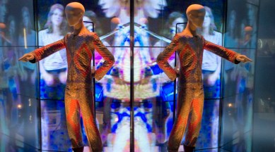 Some items are iconic, such as a multicolored quilted jumpsuit designed by Freddie Burretti for Bowie’s alien rock star creation Ziggy Stardust, Kansai Yamamoto’s futuristic creations for the Aladdin Sane tour in 1973 or the Union Jack coat designed by Bowie and Alexander McQueen for the cover of 1997’s “Earthling” album.