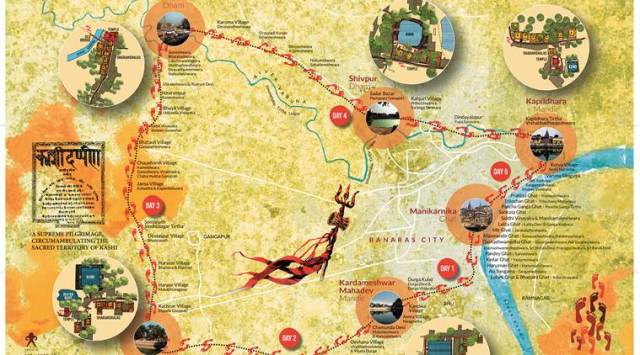 The Panchkroshi Yatra map contemporises the ancient pilgrim route by depicting the water bodies at the five halts on the way, and its association with the temples in the area. The circumambulation of Kashi is “dotted with temples, shrines, sacred trees, kunds, wells and dharamshalas”. A 19th-century interpretation of the Kashi Kshetra focuses on the cosmic significance of the city. “We wanted to present the old versus the new. The old is not a geographic map, it’s like a mandala, it shows the mythological story when Shiva came with the gods and resided here. Our map is geographical, and our route shows that Kashi is not really a circle but organic and meandering. Of course, there are many temples that are sited which correspond to the actual location even today,” says Gupta.