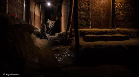 The description of the photo on the NHM website reads, “With growing human-leopard conflict grabbing the headlines, Nayan was determined to show things could be different. Positioning his camera trap so a passing cat would not dominate the frame, the wait began. After four months, he finally captured this unique human-leopard co-existence as this big cat weaves its way silently through the alley.”