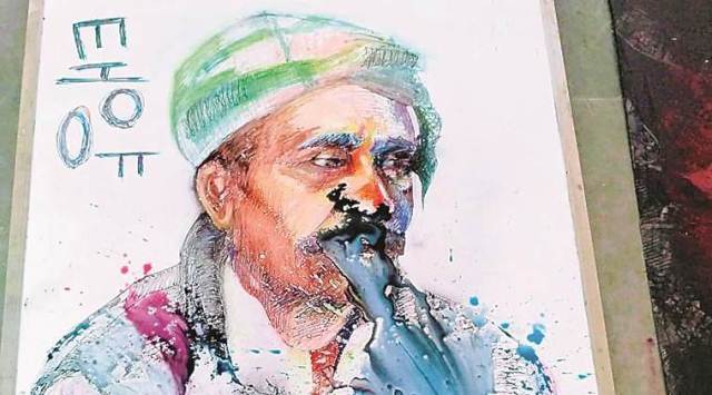 Artist Sun Robin aspires to “become the biggest artist in the universe and leave a mark on the world”. The artist was recently awarded the Punjabi Lalit Kala Akademi award for his mixed-media work Ghuttan, made in an hour on a whiteboard surface. The composition, he says, began with a sketch pen portrait of a local model. Not satisfied with what he had made, he decided to douse it with water. The outcome surprised the artist. “I was in a tight spot emotionally. It was as if my own feelings entered the painting” says Robin. Through the work, he attempts to depict “universal suffocation”. To preserve the work, he has coated it with watercolours and other dyes.
