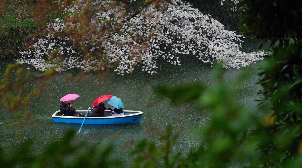 Boaters in the Chidorigafuchi Moat are surrounded by cherry trees in full bloom in Tokyo on March 25, 2023. With foreign tourists welcomed back since October, those willing to explore beyond highly trafficked neighborhoods and wander down TokyoÕs side streets will be richly rewarded. (Andrew Faulk/The New York Times)