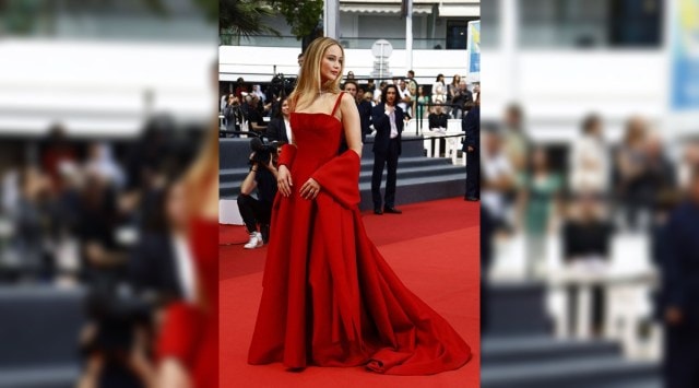 Jennifer Lawrence sported a red Christian Dior gown with a satin red arm stole. She styled the outfit with diamond choker. For makeup, she opted for rosy hues. (REUTERS/Eric Gaillard)