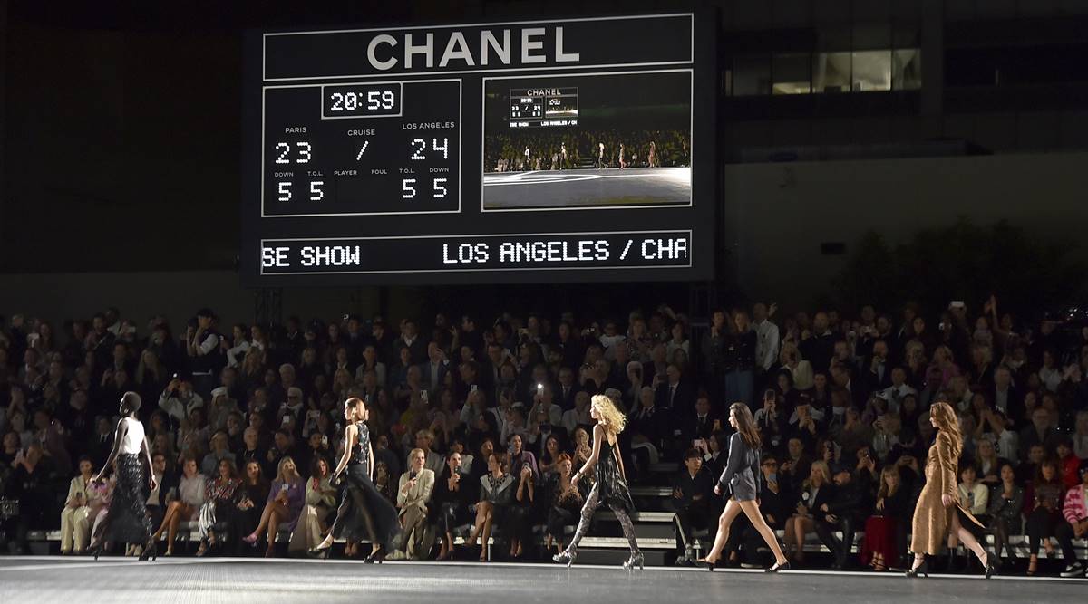 The fashion brand took hold of the Paramount Picture Studios lot to unveil its latest cruise collection on a chilly Tuesday night. It was such a splashy spectacle that even Snoop Dogg was dancing in his comfy bleacher seat while models strutted on a black-and-white Chanel basketball-like court with two large scoreboards.