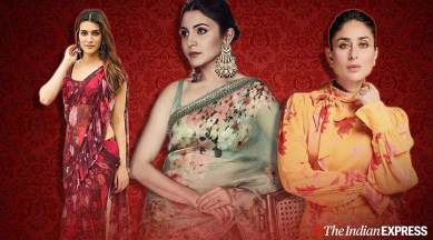 Actor Kriti Sanon looks ethereal in this violet sari with small floral designs. Her messy hair accentuates the look. The frills on the border give us all the ’90s vibes, what with that square neck blouse. And we love the silver earrings as well. For winters, you could pair your floral sari with a plain scarf to make it a look a little edgy.