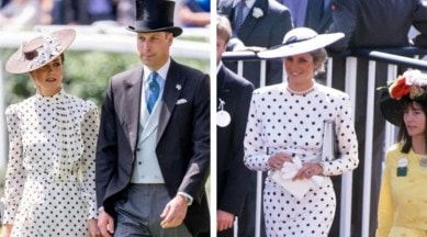 The Duchess looked lovely in a brown and white polka dot dress by Alessandra Rich, reminiscent of an almost similar look worn by her mother-in-law Princess Diana 34 years ago, at the 1988 Royal Ascot.
