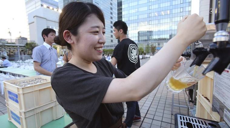 In this July 31, 2017, photo, a waitress of a beer garden pours beer into a beer mug in Tokyo. From beer gardens on the rooftops of department stores to fireworks extravaganzas to quiet, wood-paneled craft breweries, Japanese seem to quaff an awful lot of beer in the summer. (AP Photo/Koji Sasahara)