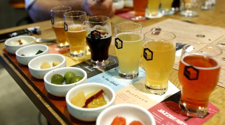 In this July 31, 2017 photo, six types of beers with snacks are displayed as it is a popular item on the menu allowing people to enjoy their taste preferences, at Spring Valley Brewery beer restaurant in Tokyo. Major beer maker Kirin opened a craft brewery – still relatively uncommon in Japan – in Tokyo’s fashionable Daikanyama district two years ago: Spring Valley Brewery. Kirin’s brewery has a western menu, spacious terrace and beers with names like DayDream and Jazzberry that are brewed behind transparent walls. (AP Photo/Shizuo Kambayashi)