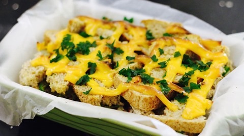 “Where’s the egg?” “It’s hidden.” “Hidden eggs?” “Yup” “Okaaaaaay” As I serve a big spoonful out from the dish onto my plate, I can see the partly cooked, partly runny egg peeping out of the bread top. Soft cheese, crispy bread, runny eggs, chunky veggies and soft bread — this hidden eggs recipe is like an potpourri of textures. Together with a mix of spices, it enables a healthy and tasty start of the day. We are slowly making food traditions in our little home. One that I enjoy most is that ‘the man’ cooks the weekend breakfast. And my man loves to cook — but it has to be interesting and new. It can’t be an everyday recipe, so every Saturday he would be looking for new inspiration. I see him open the refrigerator, then the spice drawer, then the pantry and then back to the refrigerator. I simply answer questions and enjoy the process. Blessed mornings! Hidden eggs Preparation: 10 mins | Cooking: 30 mins| Serves: 2 Ingredients 4 - eggs (at room temperature) 6 slices - Bread 1/2 cup slices - Green bell peppers and white onions 1/2 tsp - Oregano and thyme seasoning Salt and black pepper to taste Red chilli flakes to taste (we used 1/2 tsp) 4 tbsp - Melted butter 2 slices - Cheddar cheese Fresh parsley for garnishing Method * Preheat oven to 200° C at the convection setting. * Line a baking dish with butter paper. * Break 3 slices of bread to cover the bottom of the dish. Drizzle half of melted butter on the bread. * Loosely spread the onion and bell peppers. Break the eggs directly on the veggies. * Sprinkle with salt, pepper, chilly flakes, oregano and thyme. * Bake in the oven for 15 minutes. * Remove and cover the top with another layer of broken bread. Drizzle the remaining butter on top and cover with grated cheese or cheese slice cut into strips. * Return to the oven and bake for another 10 minutes. * Remove, garnish with parsley and serve hot. For news updates, follow us on Facebook, Twitter, Google+ & Instagram