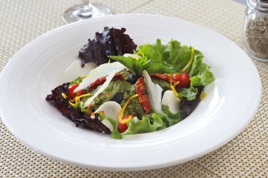 * In a mixing bowl add cherry mozzarella, sundried tomatoes, green olive, black olive, mixed lettuce, parmesan, cherry tomato and mix it with the pesto sauce.