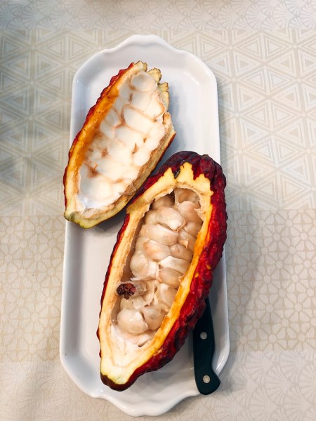 The fruit is slightly sweet and slightly sour, and has a pleasing, thick texture kind of like passionfruit. The seed inside, of course, is the cacao bean, which is traditionally fermented and roasted to make chocolate.
