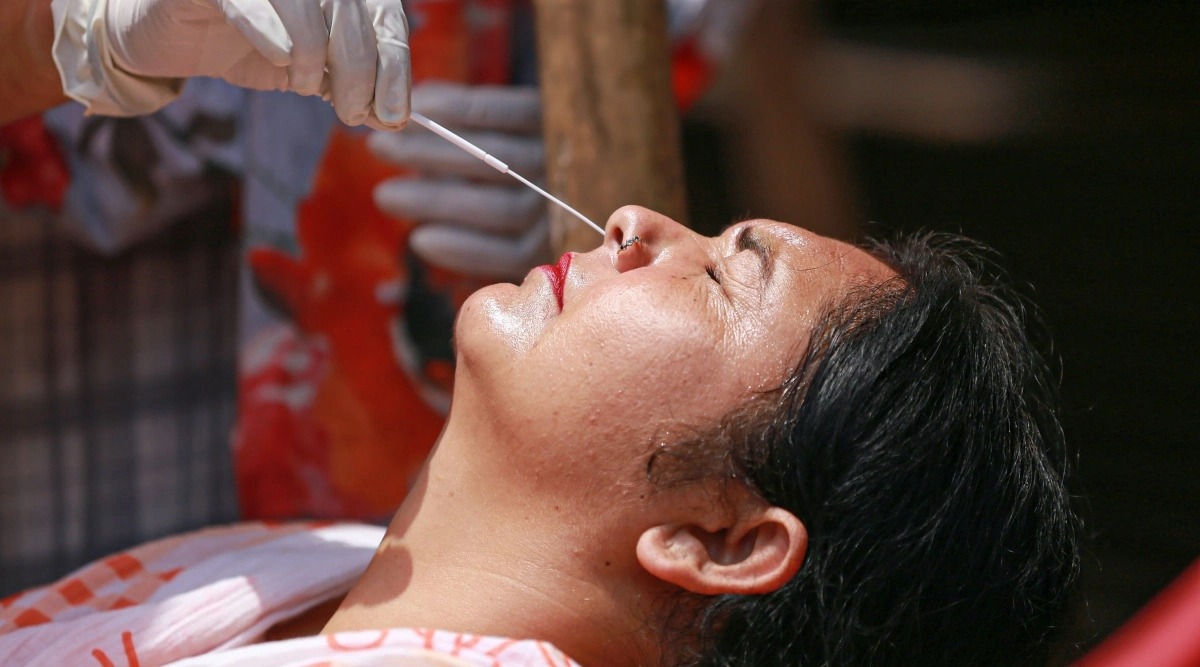 A healthcare worker conducts Covid-19 testing of a woman as coronavirus case surge countrywide, in Jammu. (PTI, file)