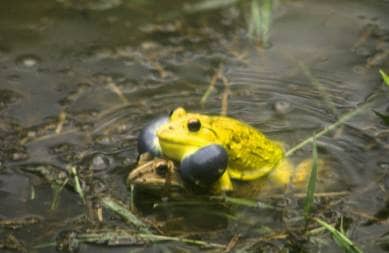 One monsoon several years ago, I attended what can only be described as the bullfrog equivalent of Woodstock, on the Delhi Ridge. A depression in the ground had filled with rain water and here, perhaps, 250-300 great golden bullfrogs were having the orgy of their lives. The girls were having a rough ride as these fat bumptious rowdies literally leapt on them and smothered them, one on top of the other. Several of the ladies simply skittered away as fast as they could, only to be relentlessly pursued, or kicked out heftily at them. Other males sat around inflating and deflating their steel blue cheek pouches as they croaked away to glory. Apparently, the deeper the baritone, the better the girls like it, and every species has its own signature croak.
