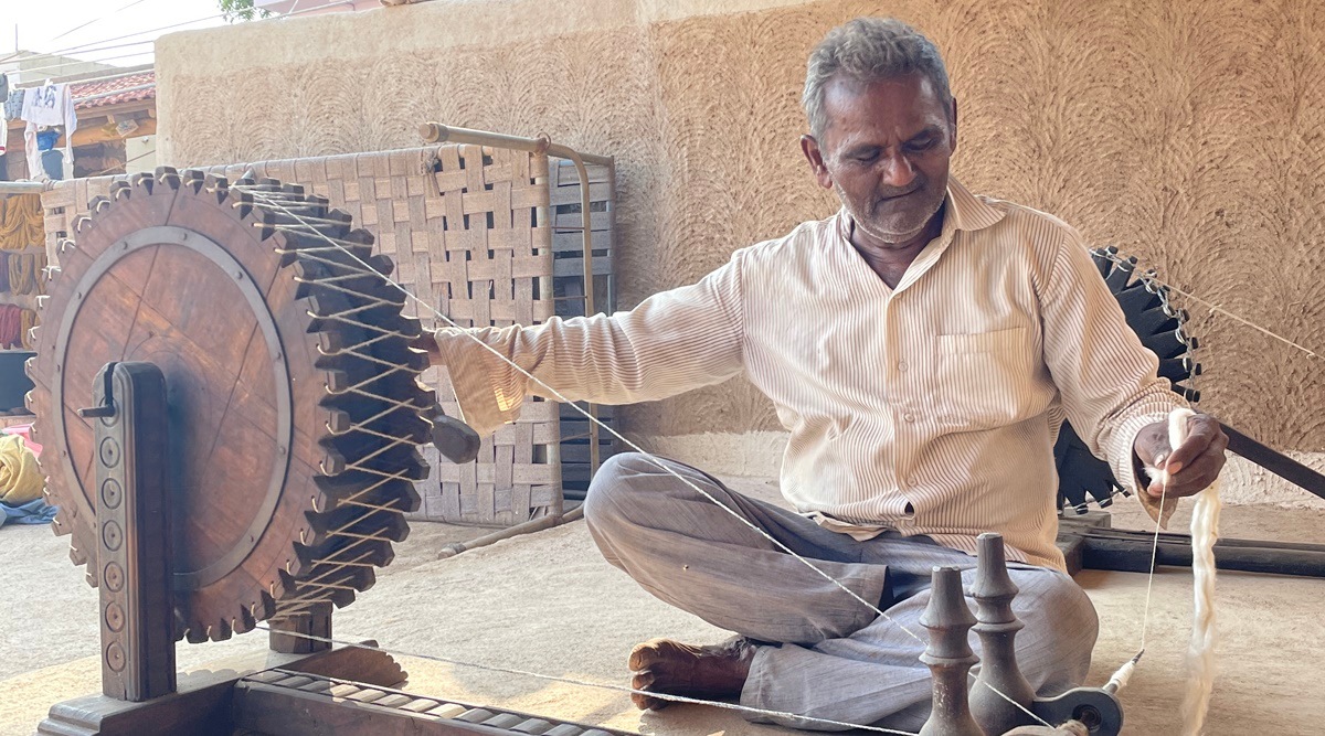 An artisan spinning yarn on a charkha at the Kutchi Bazaar facility in Kutch, Gujarat. (Photo: Kutchi Bazaar)