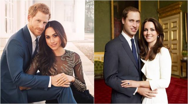 In the adorable black-and-white casual photo, the former Suits star can be seen wearing a sweater by Victoria Beckham while embracing her prince charming and showing off her stunning diamond ring. The pose is similar to Kate-William’s photo where she too flaunted her engagement ring that was previously worn by Princess Diana, with her hands resting on her husband’s shoulder, wearing a similar pastel top by Whistle.
