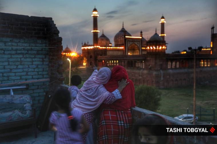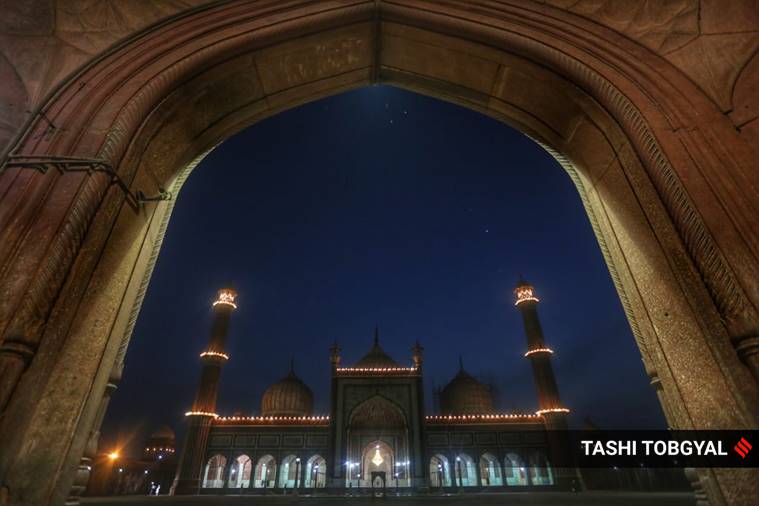 Residents of Old Delhi look out for the moon by the illuminated Jama Masjid on the eve of Ramadan on Friday. (Express Photograph by Tashi Tobgyal)