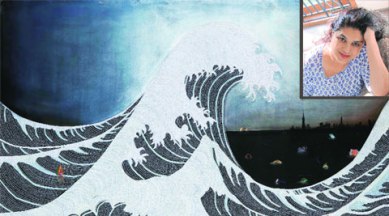 I have borrowed from Hokusai the elements of landscape paintings, depicting the sublime and evocative of other powerful emotions. My work, The Urban Sublime, provokes philosophical, intellectual and political objectives. The large wave is about to crash into the city shore, depicting the ocean of migrants which the city holds or is about to hold within itself. The broken objects floating around are devoid of their human counterparts. They are shown drowning in the million human voices, just about to disappear in the city. The work deals with the power of this wave of migration, which controls the city by its reasons and needs.