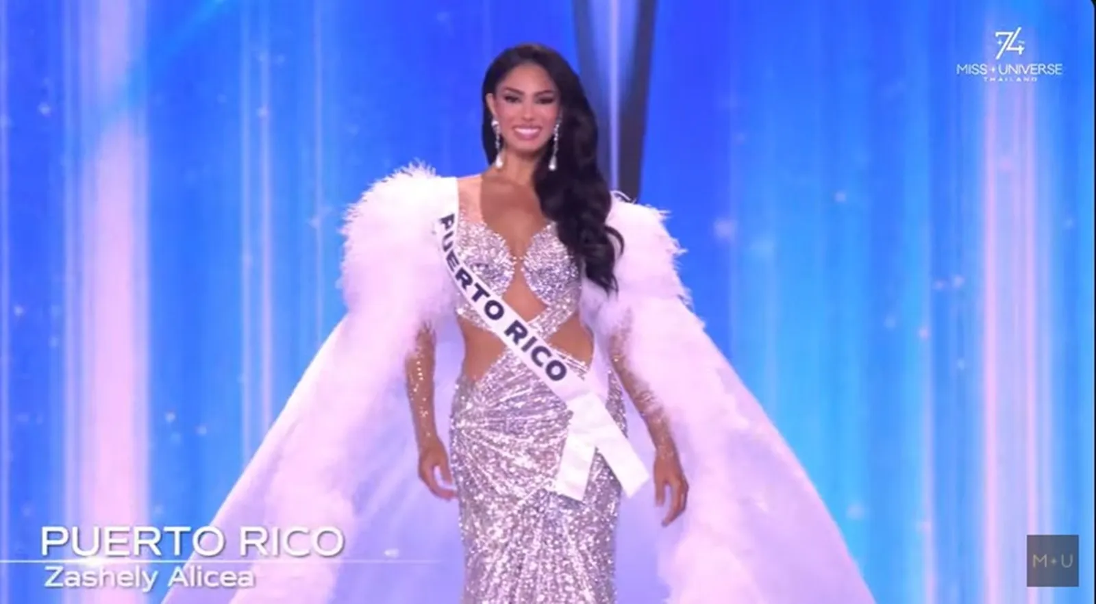 Puerto Rico's Zashely Alicea sashays down the ramp in a silver number with a dramatic faux feather cape at the Evening Gown round. Take at look at her outfit here.