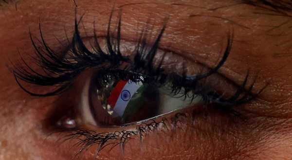Reflection of the tricolour seen in the eye of a girl participating in the “Har Ghar Tiranga” campaign, on the eve of Independence Day in New Delhi. (Express photo by Praveen Khanna)
