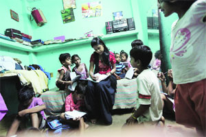 Usha (I dont use my second name) Shrivas,18,lives in Ekta Vihar near Sector 6,RK Puram. She blushes when asked about the scampering on the first floor of her house: Those are the kids I tutor. She has kept this a secret from her friends at Maitreyi College. These children pay me Rs 100 a month,but most of them dont pay regularly.