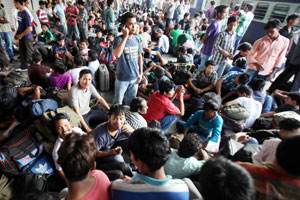Hotel owners and security agency officials could be seen pleading with their employees at the Bangalore City railway station to dissuade them from leaving. However,the steady flow of those trying to get on board the Guwahati Express,which runs on Wednesdays,Thursdays and Fridays,continued.