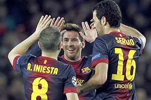 Messi’s superb double set Barca on their way in the first half at a raucous but desperately tense Nou Camp and David Villa and Jordi Alba struck after the break to send the La Liga side through to the quarter-finals 4-2 on aggregate.