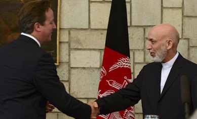 Cameron visited troops in the southern province of Helmand before meeting with President Hamid Karzai as the Afghan government and international powers try to revive peace efforts that recently collapsed in ignominy.