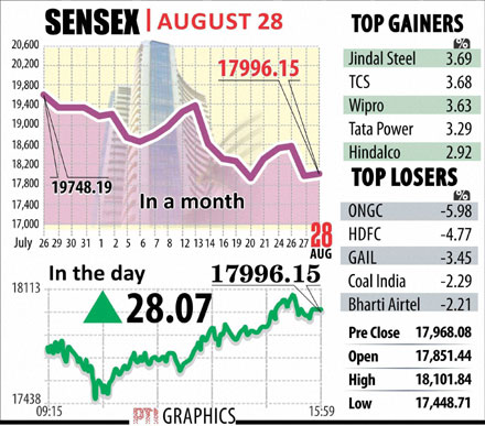 As the Indian rupeerebounded,value-buying set in to help the index erase the day’s losses and climb to 18,101.84 before ending at 17,996.15,a gain of 28.07 points,or 0.16 per cent.