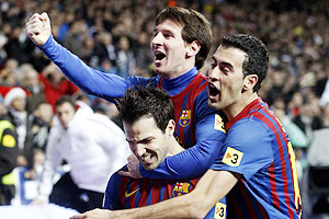 Barcelona overcame the shock of conceding a goal after just 23 seconds - the fastest in El Clasico history - to defeat bitter rivals Real Madrid 3-1 and go top of La Liga. French striker Karim Benzema scored the early goal to give Real a 1-0 lead after a terrible clearance from Barcelona goalkeeper Victor Valdes. Alexis Sanchez,who was chosen ahead of David Villa,levelled in the 30th minute after a sublime through ball from Lionel Messi. A drive from Xavi in the 53rd minute took a wicked deflection off Marcelo and beyond the desperate reach of Iker Casillas in the Real goal as Barcelona went into a 2-1 lead last night. Cesc Fabregas added the third in the 65th minute,scoring with a diving header from a fine cross by Dani Alves. It was the former Arsenal man's 10th league goal of the campaign. Real,who now trail Barca on goal difference,still have a game in hand over the reigning champions,but this result brought to an end a 15-match winning streak in all competitions for Jose Mourinho's side. An astonishing injury-time brace from Ruben Castro saw Real Betis come from behind to snatch a 2-1 win over Valencia and end a run of 10 matches without a victory. Valencia,who are seven points behind Barcelona and Real,were undone in the final minutes. There were few chances in a high tempo first half which was emphasised by the hard work from both teams' midfielders but after the break Betis took charge. Jonathan Pereira in particular caused a threat down the wing and the Valencia defence was stretched to the limit. A Benat Etxebarria free-kick was saved by Valencia keeper Diego Alves but the best chance fell to Castro who blazed over from inside the area.