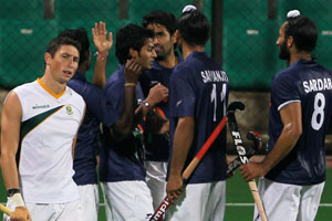 Promising youngster Yuvraj Walmiki struck twice as India registered a thrilling 4-3 victory over South Africa in the fourth hockey Test as they clinched the five-match series 3-1. India scored four second half goals through Yuvraj (44th minute,53rd),V R Raghunath (50th) and S K Uthappa (56th) after Justin Reid Ross (14th) gave South Africa the lead in the first half at the floodlit Major Dhyan Chand National Stadium. The tourists,however,did not give up till the last minute and managed to reduce the margin through Ian Haley (54th) and Lloyd Madsen (64th). With this win,India has taken an unassailable 3-1 lead in the five-match series. India had earlier defeated South Africa 4-0 and 2-1 in the first two Tests before the visitors scored a 1-3 victory in the third tie. The final Test of the series will be played on Sunday after a rest day tomorrow. Contrary to the result,the South Africans were by far the better side on display in the first half as the Indians found it difficult to breach their strong defence. South Africa also played fast paced one-touch hockey in the opening period and created more spaces during their attacks. And as expected the visitors drew the first blood when Reid Ross beautifully found the back of the Indian net with a reverse shot after receiving a cross from the right. Trailing 0-1,the Indians came out with more purpose in the second period and drew parity when an opportunistic Yuvraj tapped home after he was set up by Sarvanjit Singh's solo run from the right flank.