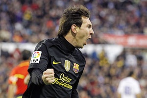Lionel Messi became the first player in almost 40 years to score 60 goals in a single European top-flight season after a brace helped Barcelona come from behind to beat 10-man Zaragoza 4-1. Messi's 23 goals from the last 12 games has helped him arrive at the landmark 60 figure,the first time since Gerd Muller scored 67 goals in the 1972-73 season for Bayern Munich. With a minimum of nine games still to play in the league and cup,24-year-old Messi has the German's record well within his sights. Barca's victory yesterday also helped the champions slash Real Madrid's lead to three points with Jose Mourinho's side facing a tough April schedule,starting against third-placed Valencia today. After that comes the Madrid derby against Atletico and the El Clasico showdown with Barca also to feature. Relegation-haunted Zaragoza took advantage of a slow start from Barca with Carlos Aranda heading them in front in the 30th minute after earlier missing a penalty. Carles Puyol brought Barca back on level terms six minutes later and then Messi hit a double towards the end of either half,the second from the penalty spot. In injury time,Messi set up Pedro Rodriguez for the fourth. "All we can do is keep going and see what happens in the matches still to play. We knew this would be a difficult game for the way that the opposition has been playing in the last month and the state of the pitch made it worse for both of us," said Barca coach Pep Guardiola. "Everyone does it to try and make it difficult for us but it also makes it hard for them as well." "There are more fouls,the game is slower and there is more contact. They do it to all the pitches except San Mames (Athletic Bilbao),even the Bernabeu. In any case we have always won when they have kept the grass long," Guardiola added. Zaragoza's hopes of a comeback had been hit a minute before half time with the dismissal of Abraham Minero. It was a new-look Barca side to that which beat AC Milan to qualify for the Champions League semi-finals in midweek with Gerard Pique missing through injury while Xavi Hernandez,Andres Iniesta and Sergio Busquets were rested. That meant Alexis Sanchez and Pedro Rodriguez got a chance in attack. Zaragoza,on a high after three straight wins saw them move off the bottom of the table,took the game to the champions. Puyol and Javier Mascherano were struggling against the imposing Aranda who had his first chance after five minutes when he just failed to connect with a cross from Ruben Micael. Again Aranda was heavily involved as Zaragoza won a penalty after 23 minutes. He latched onto a cross from Ivan Obradovic with his effort coming back off the post,and then keeper Victor Valdes failed to get to the ball before Angel Lafita brought him down. Valdes redeemed himself though by parrying a weak spot-kick from Aranda. Barca were slowly getting into the game when Zaragoza took the lead through Aranda after a through ball by Pablo Alvarez. That was the spur that Barca needed and at the other end Alexis had a shot from close range blocked by keeper Roberto Jimenez. From the resulting corner,the visitors equalised after a howler from the shot stopper. Roberto dropped the cross at the feet of Puyol who slotted home gratefully. Minutes later,Messi turned the game on its head making easy work of going round defender Paulo Da Silva before firing into the roof of the net. Before half-time Zaragoza were reduced to 10 men following the expulsion of Abraham for a second yellow card. Sanchez won a penalty five minutes from the end after a foul by Javier Peredes and Messi made no mistake from 12 yards. In stoppage time,Pedro finished off a pass from Messi to give them an emphatic scoreline. Miguel Perez 'Michu' scored a hat-trick as Rayo Vallecano took a step closer to safety with a 6-0 thrashing of Osasuna. Diego Costa,Emiliano Armenteros and Roberto Triguero 'Tito' were also on target and the visitors have now conceded eleven goals in two matches following their 5-1 defeat by Real Madrid last weekend. Getafe added to bottom side Sporting Gijon's problems with a 2-0 win thanks to goals for Nicolas Miku and Diego Castro while Espanyol came from two goals down to draw 2-2 against Real Sociedad.