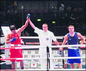 Late Wednesday night India time,he assured the country of its first-ever world boxing championships medal by entering the semi-final of the tournament in Milan. The 23-year-old beat Sergiy Derevyanchenko of Ukraine 12-4,and will meet Abbos Atoev of Uzbekistan on Friday for a shot at the final.