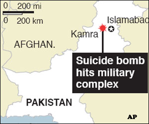 The complex at Kamra or its workers have been targeted at least once before. In December 2007,a suicide car bomber struck near a bus carrying children of Pakistan Air Force employees,wounding five of them.