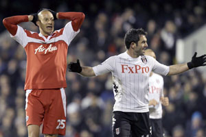 Queens Park Rangers spurned another chance to improve their chances of survival in the Premier League after a gripping 3-2 loss at Fulham on Monday left them seven points from safety with seven games to play. Fulham exploited generous defending from their west London rivals to establish a 3-0 lead inside 41 minutes at Craven Cottage through a Dimitar Berbatov double and a Clint Hill own goal. Adel Taarabt pulled one back in the first half and Loic Remy added a second,moments after seeing a penalty saved,before Fulham lost Steve Sidwell to a red card for a late foul on Armand Traore. QPR could not find an equaliser,however,and remain second from bottom in the table ahead of a crucial game at home to fourth-bottom Wigan Athletic on Sunday. "It was a disastrous first half and it cost us," said QPR manager Harry Redknapp. "We gave away the worst goals I've ever seen in my life. It was an absolute disaster,but then we got a goal back,came out in the second half and absolutely murdered them. "We are not giving up. We have to beat Wigan on Sunday - that is where we are at now." QPR's pressing need for goals was evident in Redknapp's decision to hand erratic Moroccan playmaker Taarabt his first league start since February 23. Fulham were unchanged from the team that won 1-0 at Tottenham Hotspur in their last outing and although they quickly hit their stride,they were abetted by some appalling defending from the visitors. Christopher Samba gifted Fulham an eighth-minute penalty by upending Ashkan Dejagah and Berbatov tucked away the spot-kick with customary sang-froid. It was the fourth consecutive league game in which the Bulgarian had scored,and in the 22nd minute he added a second. Again,Samba was at fault,dawdling in possession and allowing Berbatov to nip in and prod the ball beneath the exposed Julio Cesar. Cesar had to prevent Jose Bosingwa putting through his own goal in the 35th minute after an exquisite touch and cross from Berbatov,but Hill did not have such a fortunate escape six minutes later. Brede Hangeland found fellow Norwegian John Arne Riise with a cute back-heel and the left-back's drilled cross flicked off the QPR centre-back and beat Cesar to put the hosts 3-0 up. It had been an abject first half for QPR,but Taarabt gave them hope on the stroke of half-time when he found the bottom-left corner from 20 yards after Giorgos Karagounis gave the ball away. Taarabt then won a penalty in the 49th minute,only for Mark Schwarzer to brilliantly save Remy's effort,but the Frenchman redeemed himself two minutes later. Collecting a pass from former Marseille colleague Stephane Mbia,he span away from Philippe Senderos and then slammed home a shot off the underside of the crossbar. Referee Lee Probert brandished a straight red card after Sidwell lunged in on Traore in the 79th minute,but Martin Jol's side held on for a win that left them nine points clear of the bottom three in 10th place. "It's a bit disappointing to be 3-0 up and then make it difficult for yourselves," the Fulham manager told Sky Sports. "I thought the sending-off was a bit harsh. He tried to pull his leg out but he was red-carded and it was difficult for us. "There's a few clubs above us,like Swansea,and we've got a game in hand,so hopefully we can go a bit higher in the table."