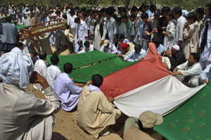 A day after the massacre by the militants,tensions prevailed in south western Pakistani city of Quetta as anti-terror police kept vigil during mass burial of the victims as the toll from the suicide bombing mounted to 65.