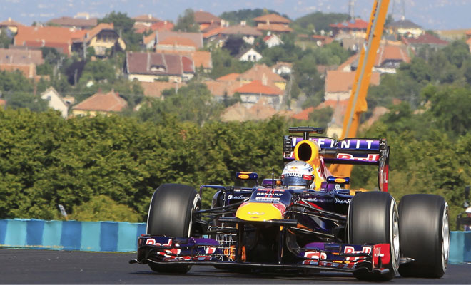 Formula One world champion Sebastian Vettel set an impressive pace as Red Bull dominated practice for the Hungarian Grand Prix on Friday with Pirelli8217;s new tyres looking very much to their liking.