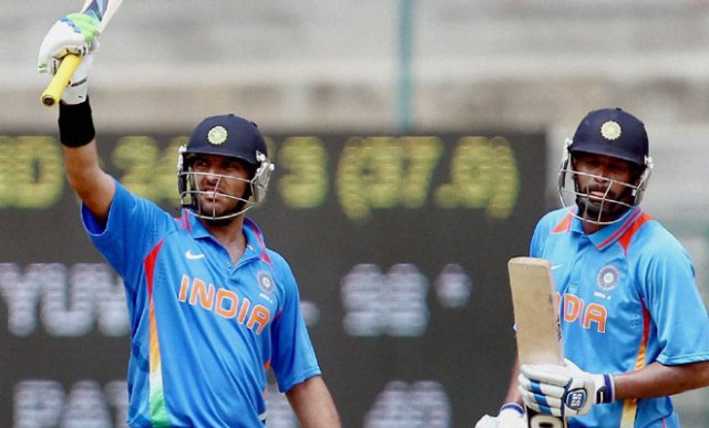 Four pure cricket shots took Yuvraj to 98. He would get his hundred with a six too,but for that he had to wait for the pyrotechnics to finish at the other end,courtesy Yusuf Pathan. Like Yuvraj,Yusuf too was last seen in action during the IPL in May. But he still seemed to be playing for KKR. With five savage slogs — three sixes and two fours — Pathan had off-spinner Ashley Nurse mourning the loss of 28 runs from his over.