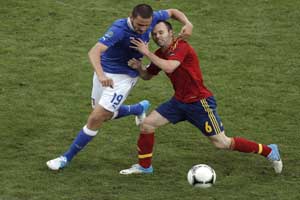 Antonio Di Natale put Italy in front after an excellent setup from Andrea Pirlo in the 61st minute,but Cesc Fabregas equalized for the defending champions three minutes later by finishing off a dazzling display of Spain’s trademark passing game.